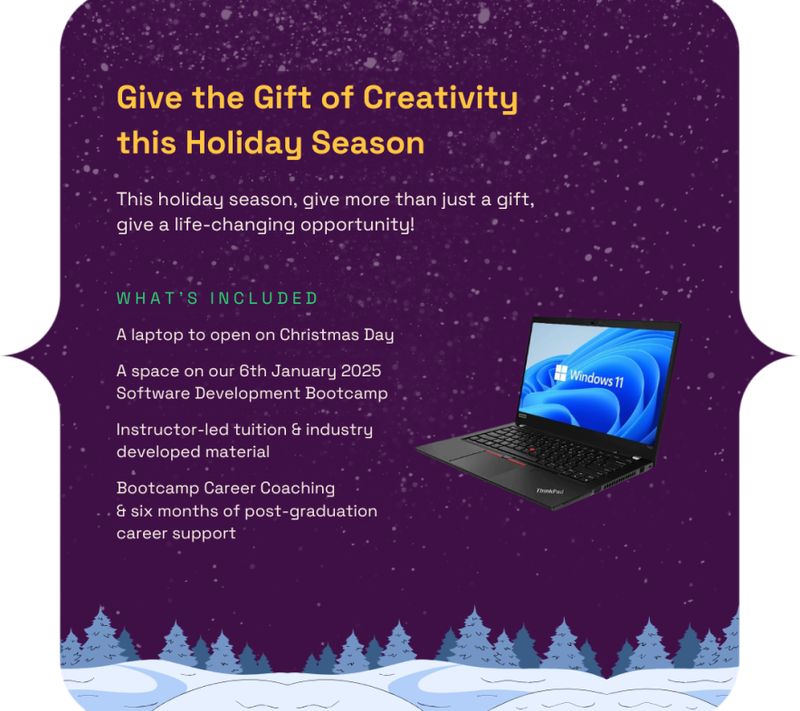 We're currently offering people the chance to give the gift of creativity to a loved one this Christmas. Our 'Give the Gift of' package includes a place on our January 2025 Software Development course and a new laptop to help them learn all the skills they'll need to start a new career in software development.